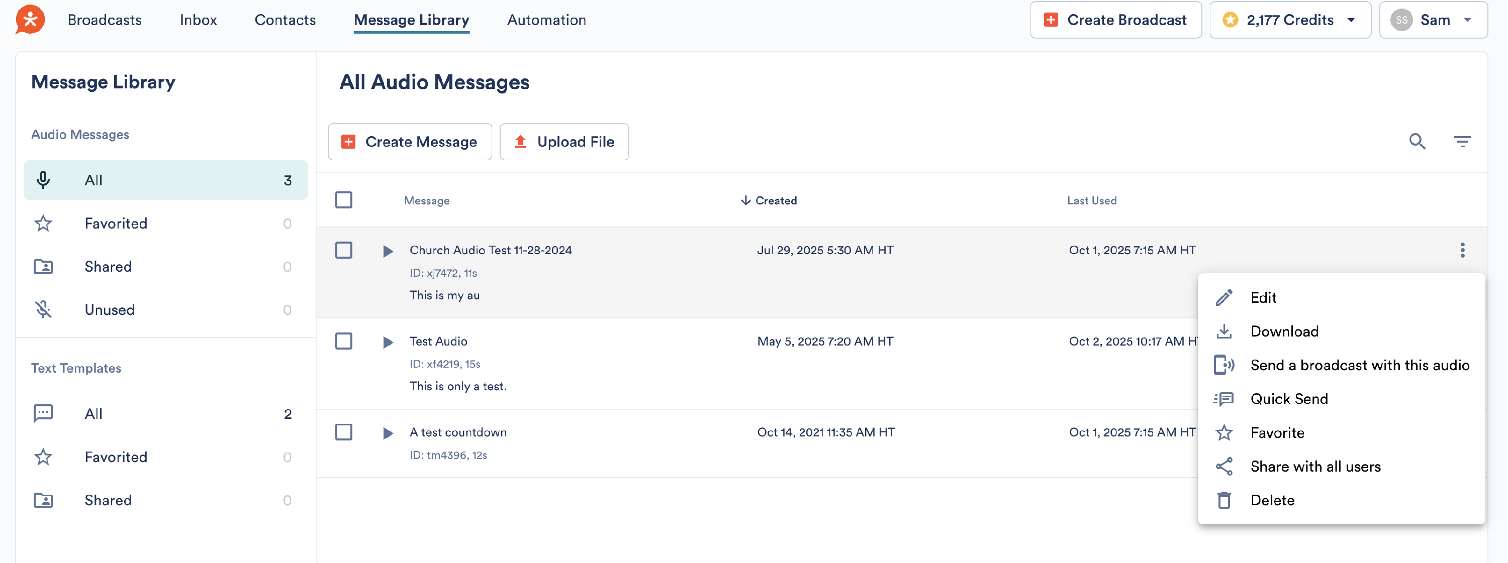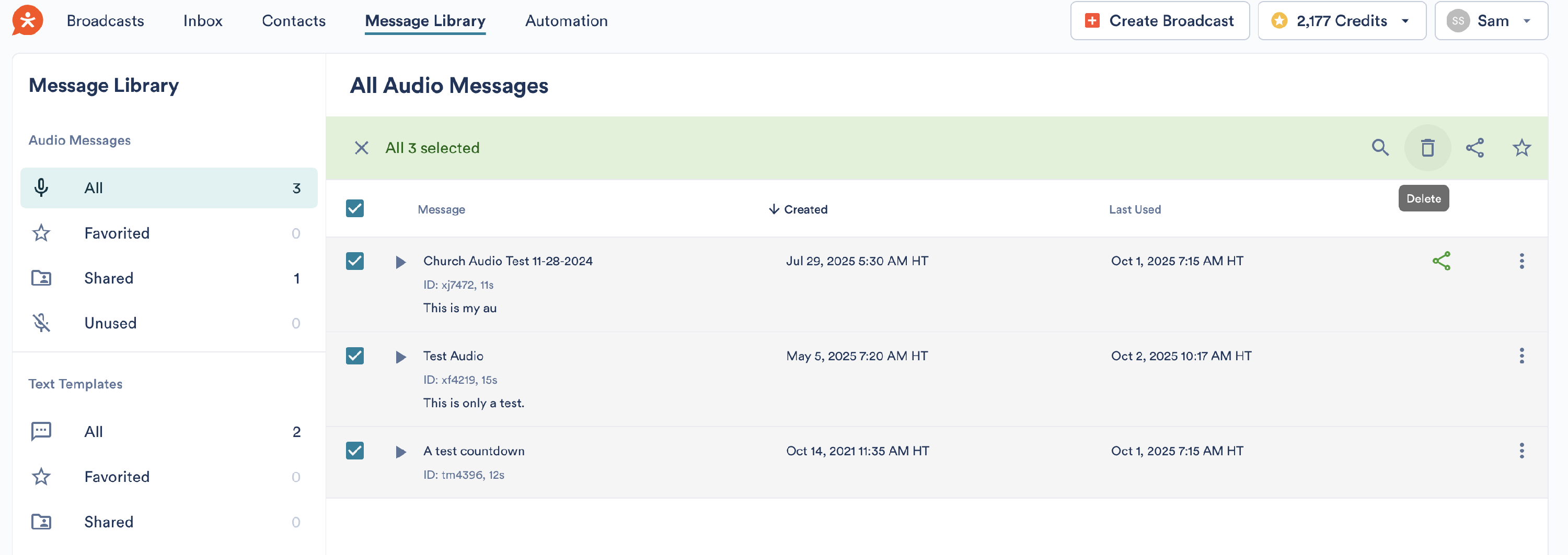 The Message Library saves a list of all audio you record and text templates that you save. You can record a message directly into your Audio Library to use when you're ready.