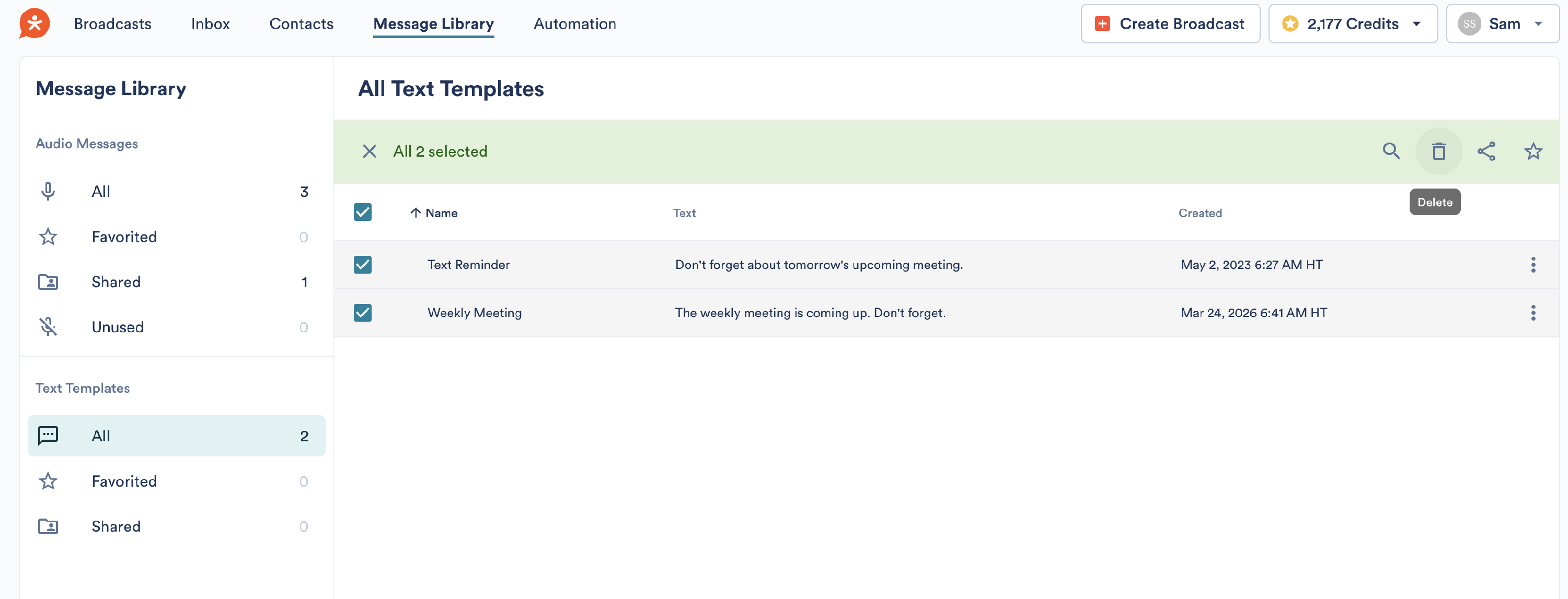Message Library is where you can find a list of audio messages and text messages that have been saved to your account. There are a number of actions you can take in the Text library.