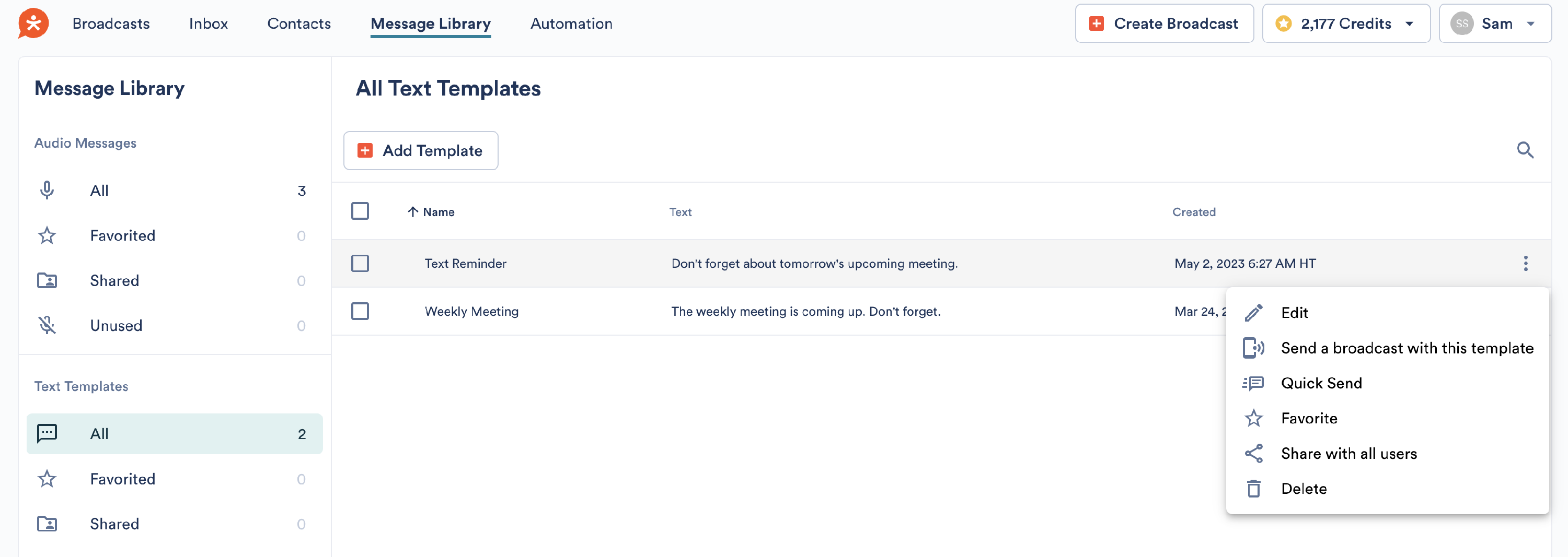 - Find the text template you wish to share and click the three-dot menu on that row.