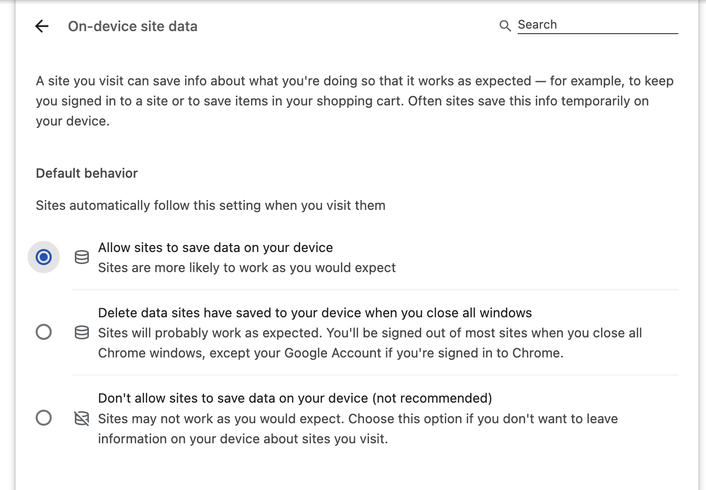 We recommend setting to "Allow sites to save data on your device."