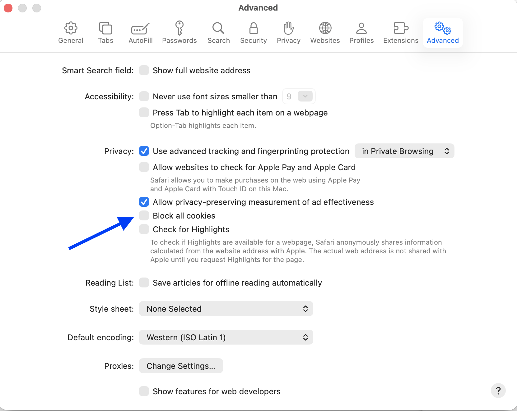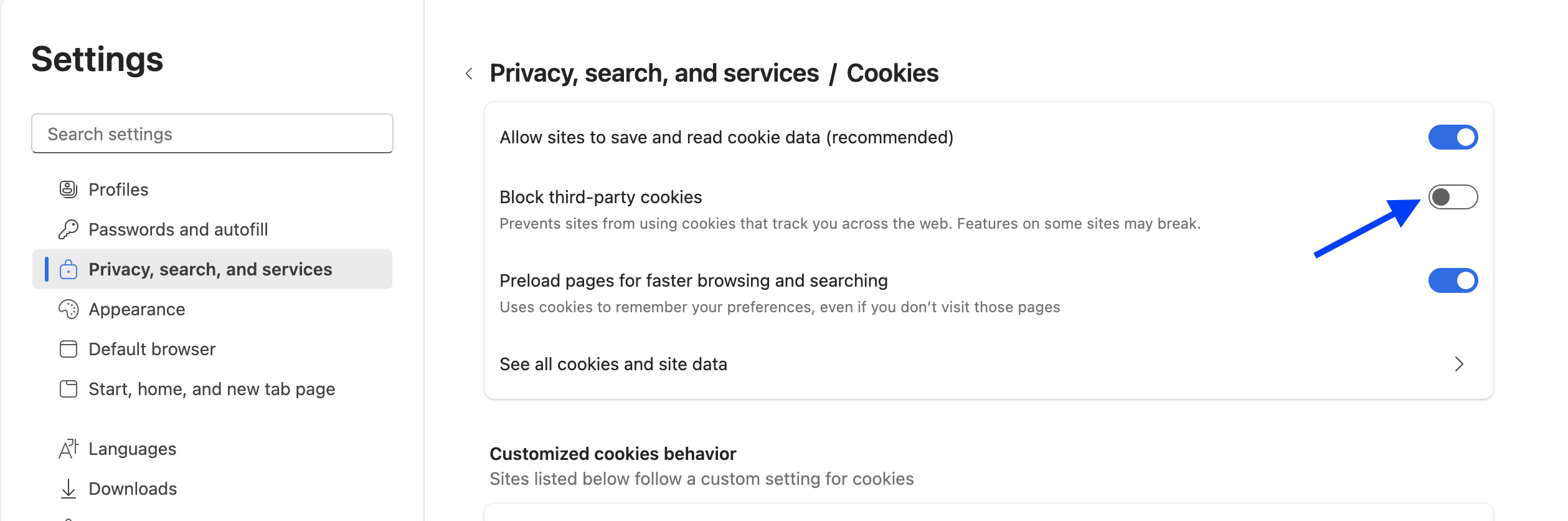- Ensure the checkbox next to "Block all cookies" is unchecked.